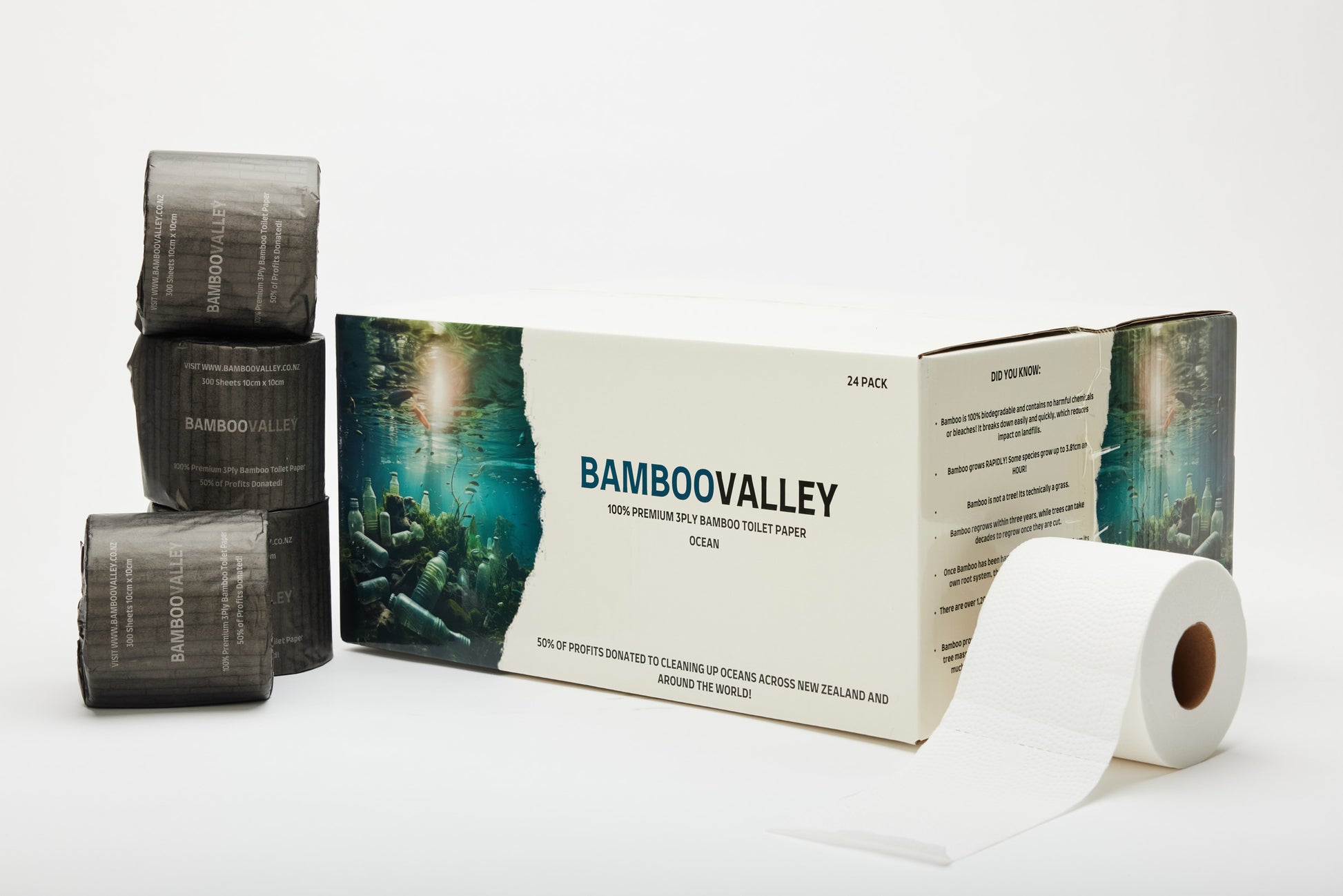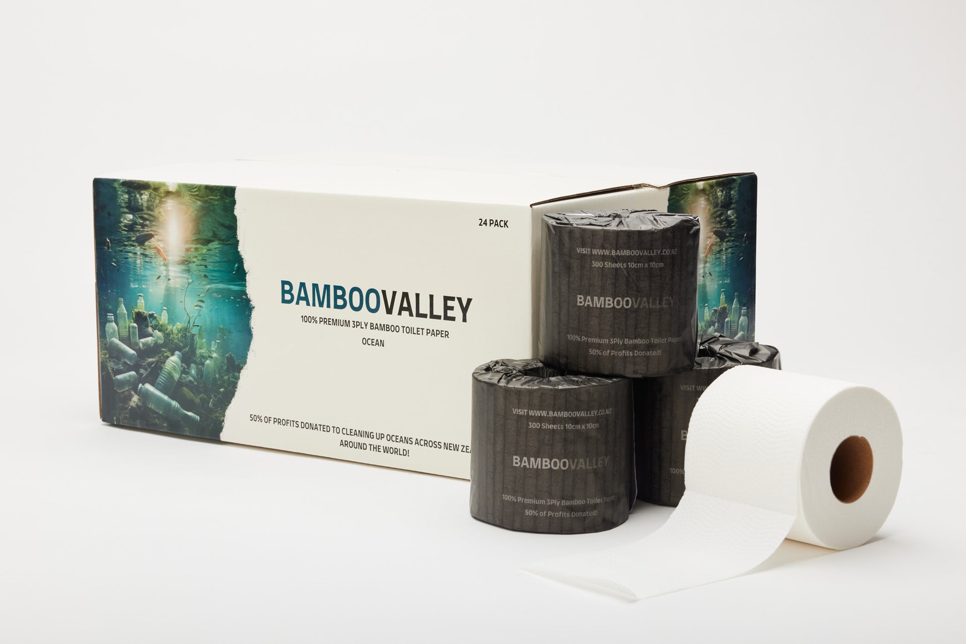 Enjoy the comfort of our 24 pack of sustainably sourced 100% Tested Bamboo Toilet Paper. Made without trees, helping save our forests and the wilderness within them. To add to this, if you select the Ocean Packaging, we will donate 50% of profits from this box to cleaning up the Ocean.